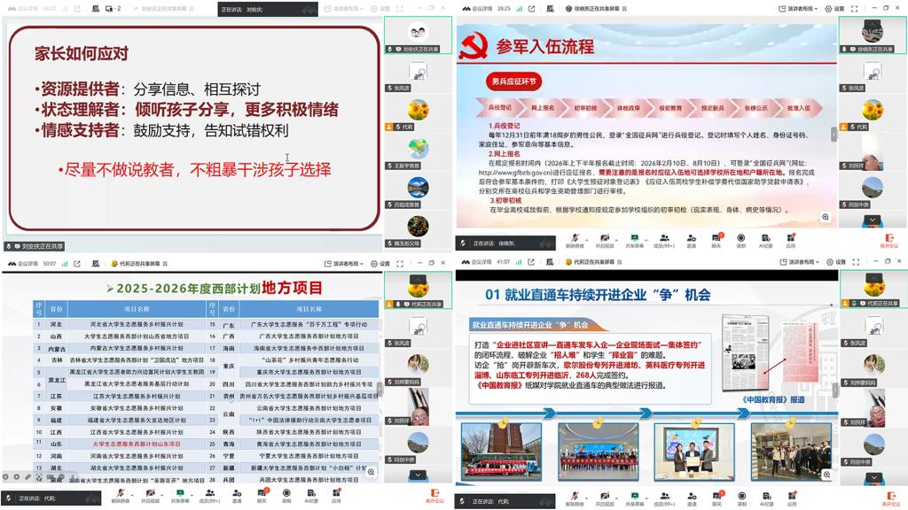 会议伊始,代莉介绍了本次家长课堂的召开目的和意义。在心理调适指导环节,刘安庆围绕考研后毕业生常见的焦虑、迷茫等情绪状态,进行了专业且通俗的解读。他结合典型案例,系统分享了科学有效的情绪疏导方法与亲子沟通技巧,引导家长做好孩子的“心理后盾”,以理解、包容与鼓励帮助孩子平稳度过考后缓冲期,为现场家长送上了一份实用的“心理指南”。征兵政策宣讲环节,徐晓东老师详细解读了2026年最新征兵条件、入伍优待政策、发展前景等家长关切的内容,从职业发展、政策扶持等多个维度,为有入伍意向的学生家长提供了指引,拓宽了毕业生家长的就业视野。就业形势解析与西部计划介绍环节,毕业生辅导员代莉依托国家权威数据与行业动态报告,客观分析了2026 届高校毕业生就业整体态势、行业需求分化特点,以及求职及多元就业赛道的机遇与挑战,引导家长理性看待就业市场,科学规划职业发展路径,详细介绍了西部计划的价值与意义,鼓励毕业生将个人理想融入国家发展,到基层去、到祖国最需要的地方去实现青春价值,为学子们提供了兼具担当与成长的多元选择。互动答疑环节,家长们踊跃提问,围绕孩子心理疏导、征兵政策细节、西部计划申报、就业规划等问题与现场嘉宾深入交流。嘉宾们耐心细致地逐一解答,现场氛围热烈而融洽,有效破解了家长们的困惑与担忧。
