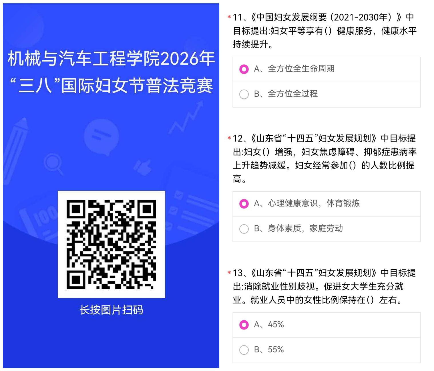 普法润心,权益护航。学院聚焦女教职工合法权益保护、职场权益维护等实用内容,积极宣传党和国家新时代关于妇女事业的方针政策,引导学院全体教职工学习宣传《中华人民共和国妇女权益保障法》等女职工权益保护法律法规政策规定,为妇女权益保障法实施营造良好的社会环境和舆论氛围。活动采用网络在线答题的形式,近150名教职工积极参与,收到了良好的普法宣传活动效果。